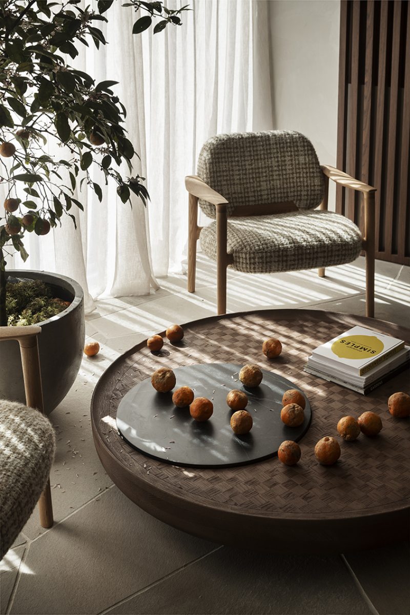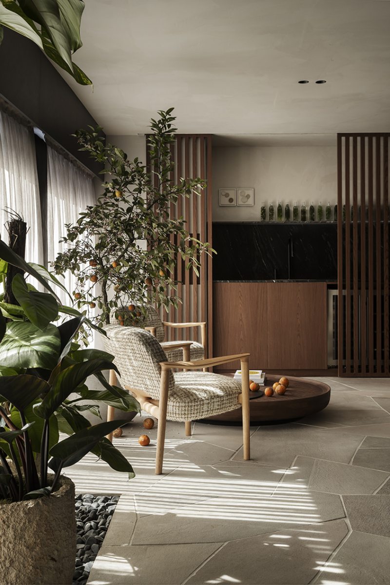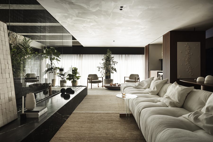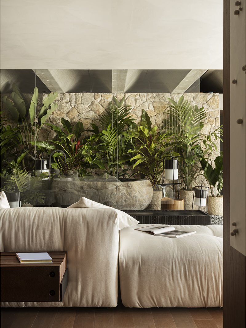 A paleta de materiais traz madeira, pedra e tecidos leves, em diálogo com elementos metálicos pontuais em latão, que ajudam a refletir a luz de maneira discreta. Uma biblioteca compõe o ambiente, inspirada nas memórias afetivas da arquiteta, e reforça o caráter introspectivo e contemplativo do espaço.