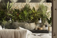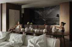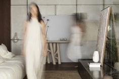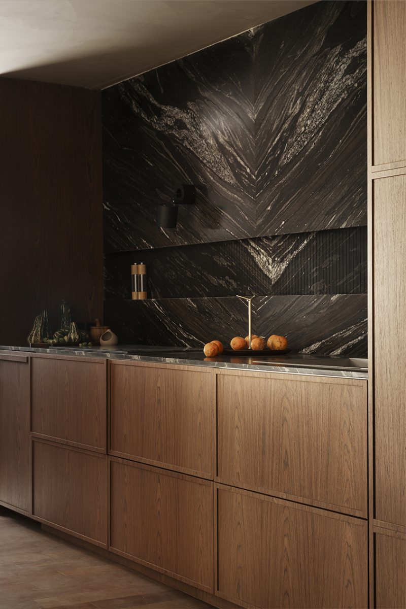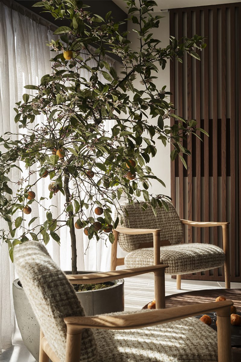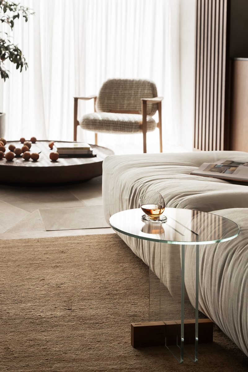 A paleta de materiais traz madeira, pedra e tecidos leves, em diálogo com elementos metálicos pontuais em latão, que ajudam a refletir a luz de maneira discreta. Uma biblioteca compõe o ambiente, inspirada nas memórias afetivas da arquiteta, e reforça o caráter introspectivo e contemplativo do espaço.