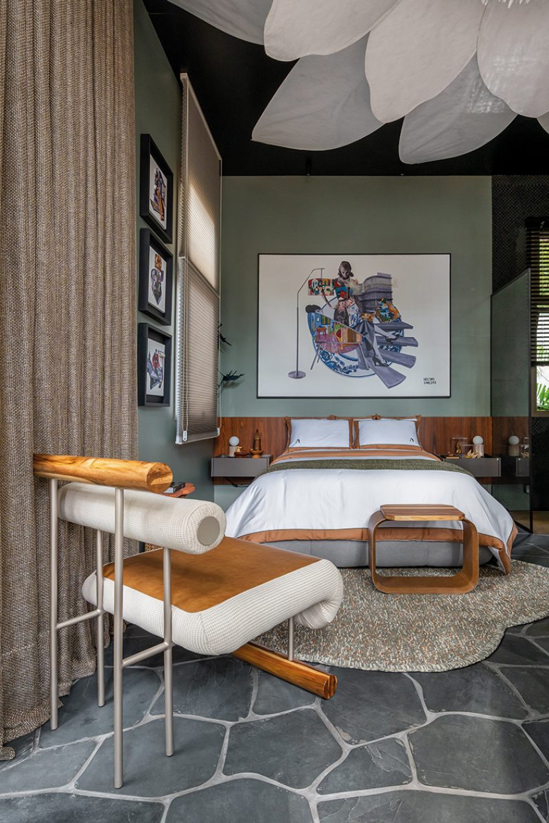 A iluminação é majoritariamente indireta, com pontos estratégicos nas laterais da cama e fitas de LED sobre a ilha. Cortinas em malha aberta da Hunter Douglas suavizam a incidência de luz natural. A escolha por revestimentos orgânicos, como o piso de ardósia com cortes assimétricos da Mosarte, reforça o diálogo com formas naturais e o conforto visual.