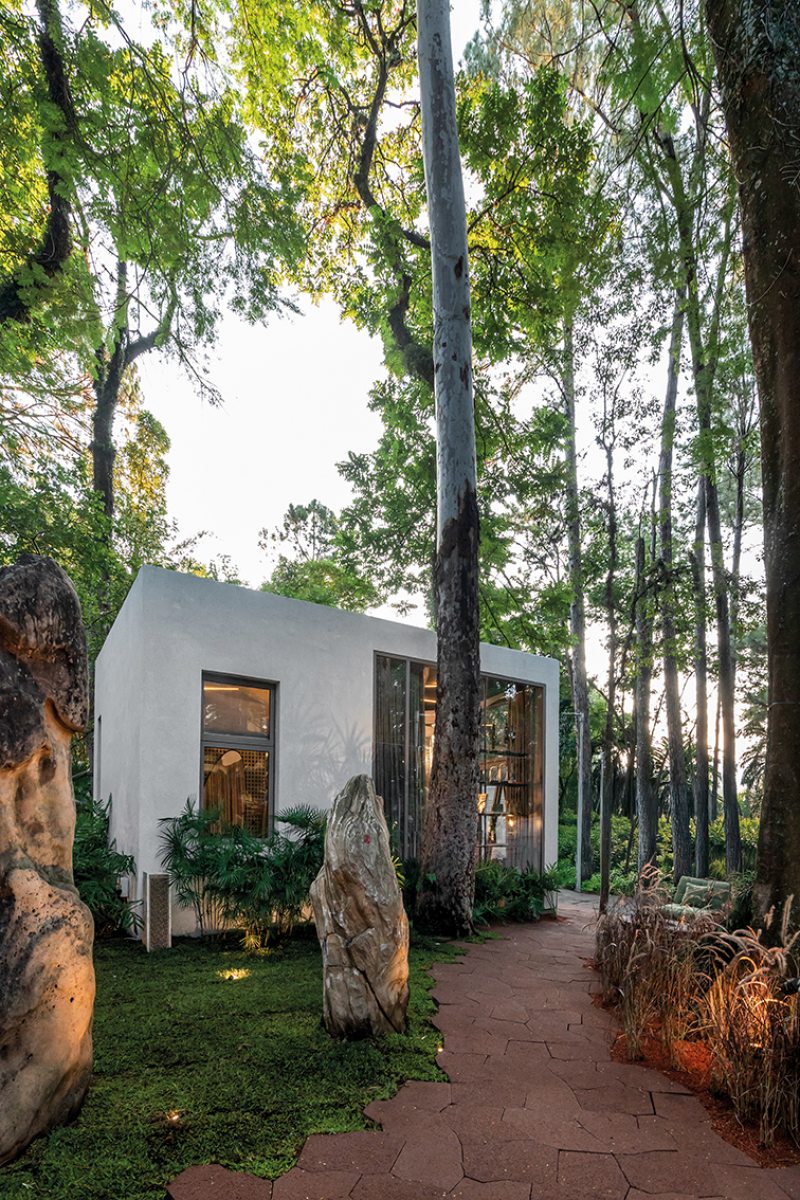 Com pé-direito de 4 metros, a casa foi erguida em apenas um mês com sistema construtivo a seco, respeitando as raízes do terreno e utilizando materiais de baixo impacto ambiental, como madeira de reflorestamento e placas de MDF já tingidas na cor verde alecrim. O projeto inclui estar, suíte, banheiro, cozinha e jardim, todos integrados com fluidez.