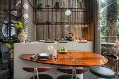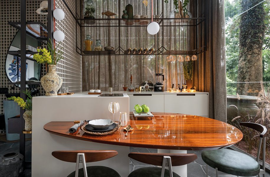 A cozinha ocupa lugar central, tanto no espaço quanto na proposta afetiva do projeto. A bancada de Corian com 2,5m, o cooktop de indução e a cuba multifuncional da Deca revelam o desejo de receber bem, com liberdade de circulação e requinte nos detalhes. A marcenaria inteligente da Fabrilis oferece armazenamento versátil e ainda delimita os espaços por meio de elementos como o muxarabi laqueado e o mobiliário sob medida, incluindo uma mesa de jantar com acabamento em pau-ferro.