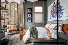A sustentabilidade aparece em soluções como o piso drenante no box do banheiro, que agiliza o escoamento e evita acúmulo de água. Há também um closet leve em serralheria, móveis suspensos, uso de couro reciclado e elementos que equilibram elegância com simplicidade.