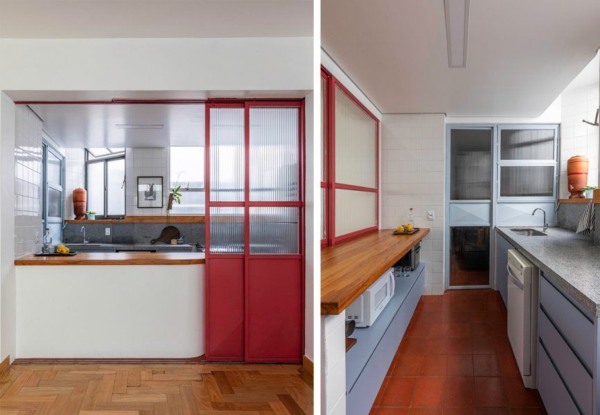 O projeto teve como foco otimizar os ambientes, ampliar a área social e integrar os espaços de forma fluida e reversível. A cozinha, antes isolada, ganhou protagonismo: o antigo banheiro de serviço foi demolido e a lavanderia, compactada. Esse gesto permitiu que a cozinha se abrisse para a sala de jantar, conectando-se aos encontros e rituais cotidianos dos moradores. Uma grande porta de serralheria com vidro canelado foi desenhada para oferecer privacidade quando necessário, mas sem perder luz ou leveza visual.