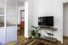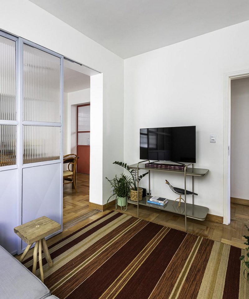 Um dos quartos foi transformado em sala de TV, ampliando a área social e oferecendo versatilidade ao uso do apartamento. Através de uma terceira porta de serralheria com vidro canelado, o espaço pode se converter em quarto de hóspedes com facilidade: um recurso que revela a preocupação com a multifuncionalidade, sem perder o caráter visual coeso do conjunto.