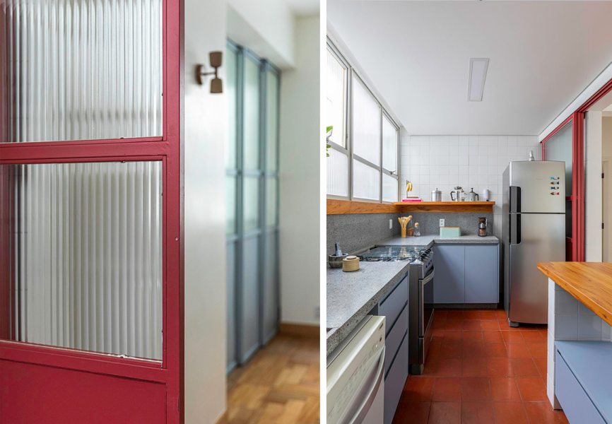 Entre a cozinha e a área de serviço, uma segunda porta metálica com aberturas generosas garante ventilação cruzada e iluminação natural. A ventilação e a transparência foram pensadas como elementos de conforto e de linguagem.