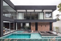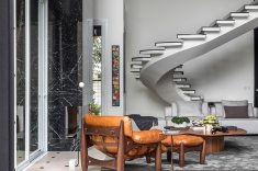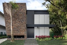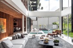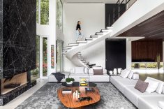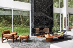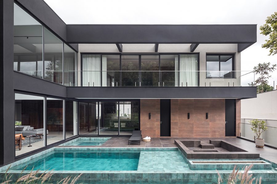 A propriedade de 700 m² foi erguida do zero e valoriza de forma estratégica sua localização: as grandes janelas em pé-direito duplo transformam a vista do bosque do condomínio em molduras naturais, como quadros vivos que se integram ao cotidiano da casa. Com linguagem contemporânea, o projeto arquitetônico e de interiores combina linhas puras e materiais nobres, como mármore e madeira.